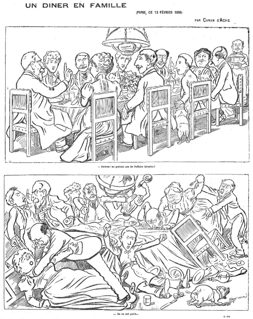 On pourra prendre la caricature de Caran d’Ache comme document d’accroche, pour construire un récit sommaire en insistant sur la profonde division du pays qui résulte de cette affaire.